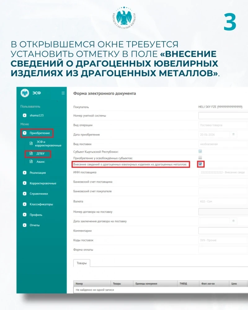 - Для внесения информации следует зайти в систему электронных счетов-фактур на сайте esf.salyk.kg, выбрать раздел "Приобретение", а затем подраздел ДПБУ.