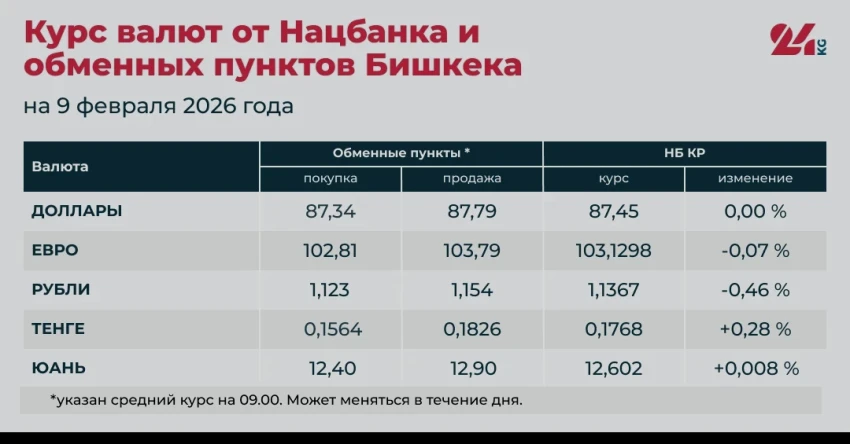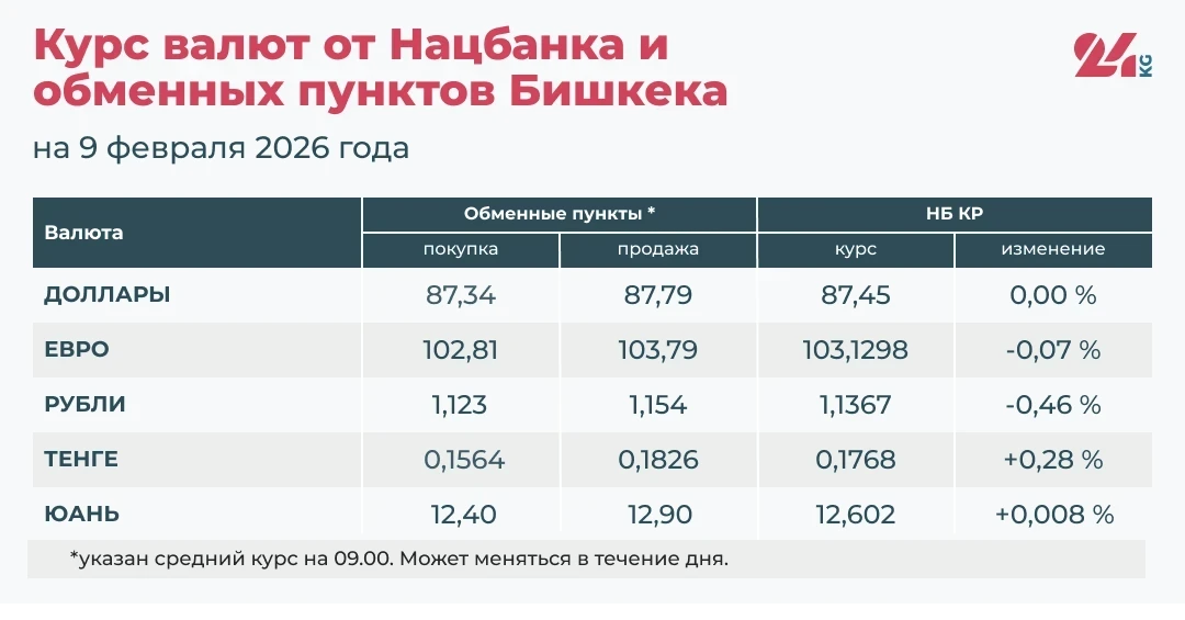 • Средний курс в обменных пунктах: покупка — 87,34 сома, продажа — 87,79 сома.