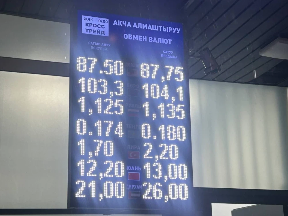 Курс доллара остается на уровне: покупка — 87,5 сома, продажа — 87,75 сома.