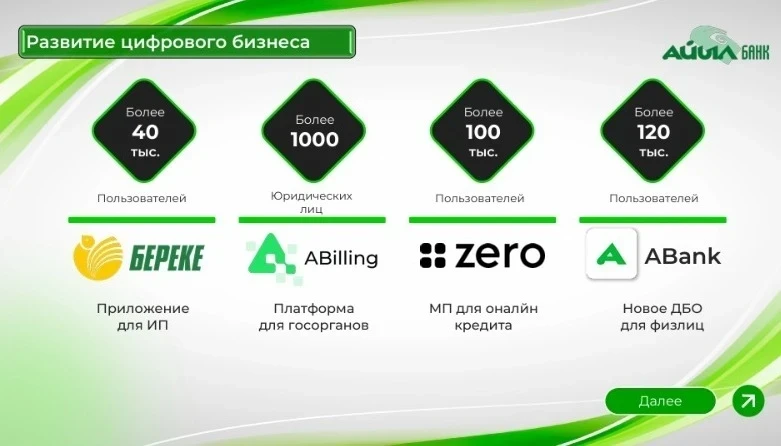 В 2024 году банк запустил цифровую бизнес-платформу «Береке» и внедрил новые решения для онлайн-кредитования и удаленного банковского обслуживания физических лиц и государственных учреждений.