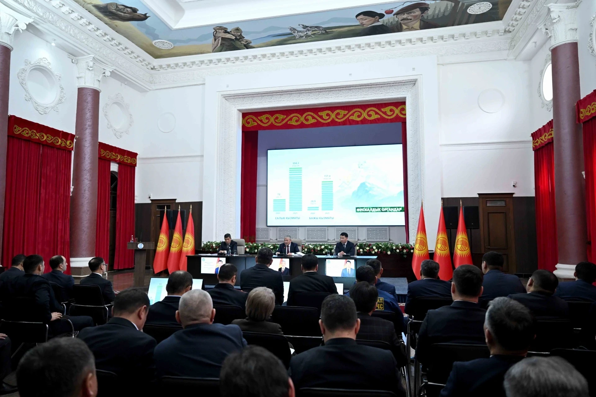 Касымалиев отметил, что за последние пять лет консолидированный бюджет страны увеличился в пять раз и превысил 1 триллион сомов. Бишкек продолжает оставаться важным финансовым узлом: из 304 миллиардов сомов, поступивших в Государственную налоговую службу, 198 миллиардов 7 миллионов сомов (примерно 65 процентов) приходятся на столицу. Он также подчеркнул необходимость прекращения безосновательных проверок бизнеса со стороны силовых и фискальных органов.