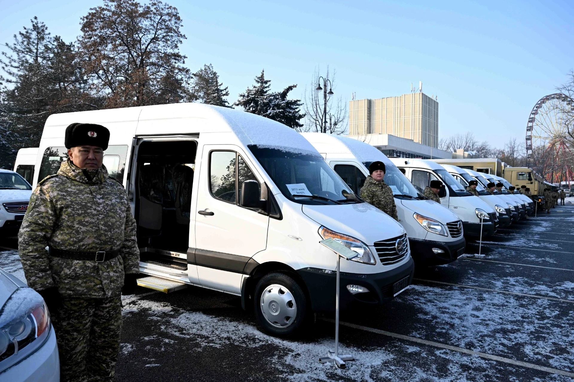 В общей сложности Министерство обороны получило 81 транспортное средство, среди которых 36 автомобилей Chevrolet Cobalt, 19 пикапов JAC T-6, 18 машин «Газель», 5 вахтовых автобусов и 3 микроавтобуса JAC Sunray. Значительная часть этой техники была произведена на заводе «Тулпар Моторс» в Кыргызской Республике.