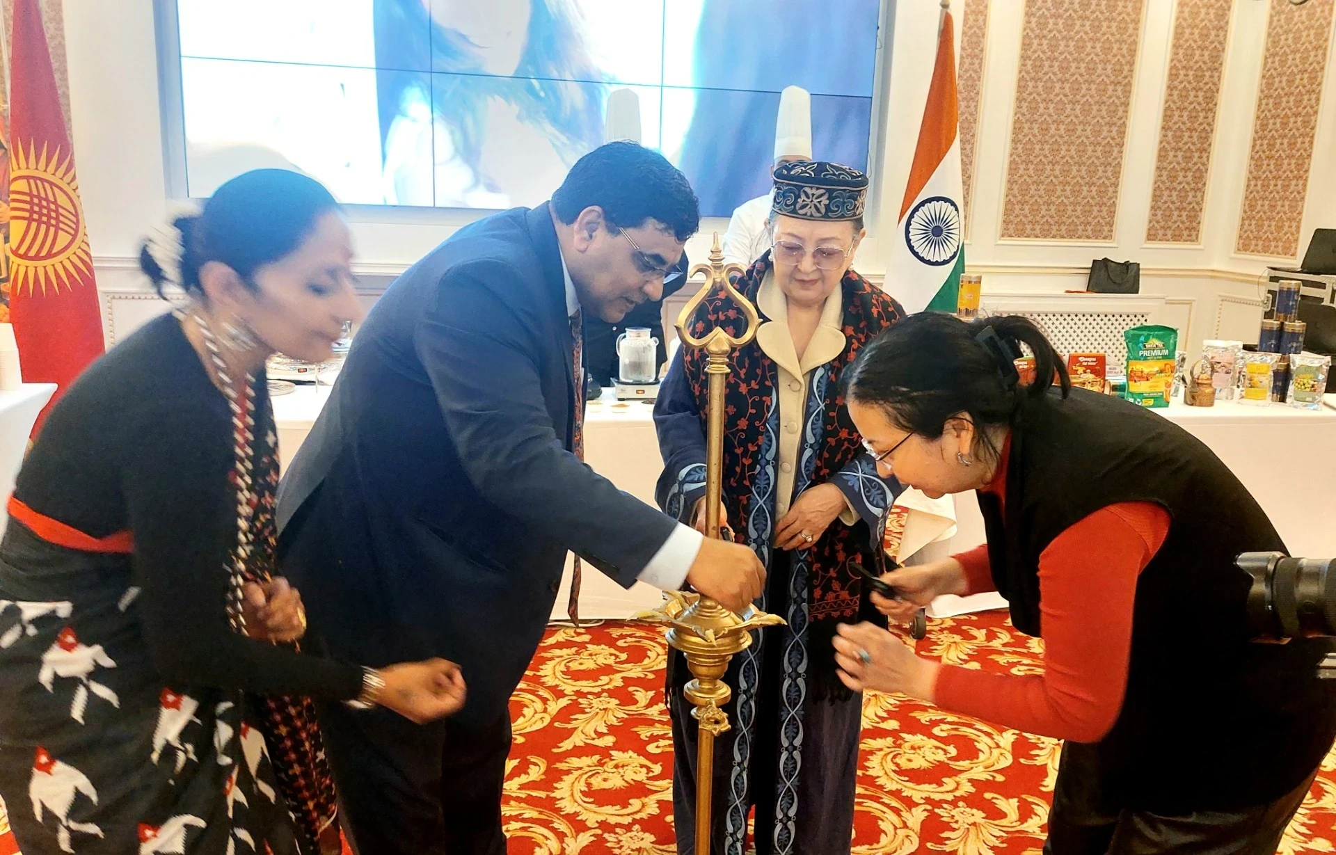 Открытие мероприятия началось с зажигания церемониальной лампы, символизирующей гармонию и свет. В церемонии участвовали Чрезвычайный и Полномочный Посол Индии в Кыргызстане Бирендер Сингх Ядав и глава Конгресса женщин в Кыргызстане Замира Акбагышева, а также другие гости.
