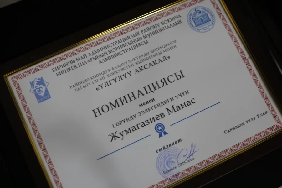 В Бишкеках, в Первомайском районе, недавно были подведены результаты конкурсов «Үлгүлүү аксакал», «Үлгүлүү байбиче», «Нарктуу келин», «Мыкты ата», «Үлгүлүү үй-бүлө», «Үлгүлүү көчө», «Үлгүлүү конуш», «Үлгүлүү ишкана» и «Үлгүлүү жамаат». Об этом сообщили в мэрии столицы.