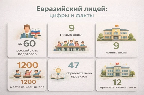 Масштаб образовательных инициатив «Евразийского лицея» в Кыргызстане впечатляет. АНО «Евразия» реализует проект по строительству 9 новых кыргызско-российских школ. Каждая область получит по одной школе, а в крупных областях — по две. Учебные заведения будут рассчитаны на более 1200 мест и будут действовать по стандартам обеих стран, выдавая аттестаты как кыргызского, так и российского образца. Первые школы уже начали строиться в Бишкеке, Баткене и Караколе, планируется завершение к концу 2025 года.