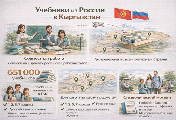 Содержимое учебников разрабатывалось совместной кыргызско-российской рабочей группой, состоящей из педагогов, методистов и экспертов двух стран. В результате была поставлена 651 тысяча экземпляров учебников, напечатанных в России и полностью доставленных в Кыргызстан. Они уже распределены по образовательным учреждениям всех регионов и внедрены в учебный процесс.