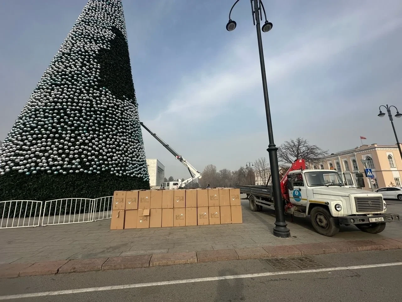 В Бишкеке начался процесс демонтажа главной новогодней елки на площади Ала-Тоо. Сотрудники городских служб приступили к снятию украшений и игрушек. Об этом сообщили в мэрии столицы агентству «Кабар».