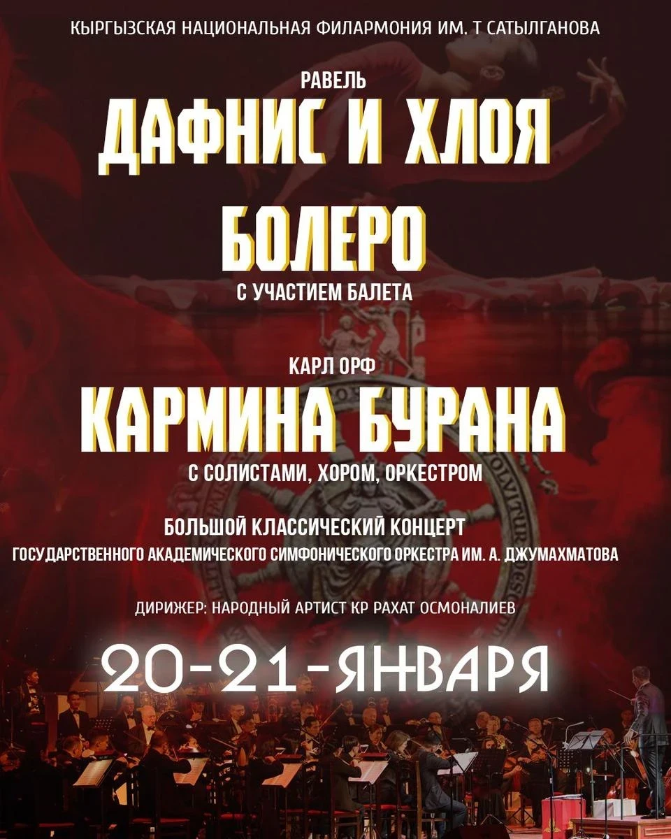 Государственный академический симфонический оркестр имени Джумахматова представит масштабную программу, в которой будут участвовать балет и хор. В рамках концерта прозвучат значимые произведения XX века, сочетающие симфоническую музыку и танец.